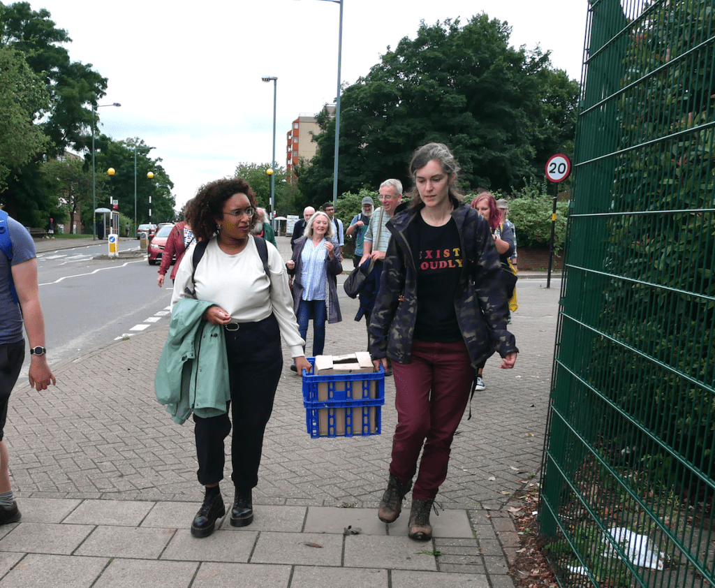 Inspired by Greek mythology we carried a specially made “Brumphalos” stone with us to mark the spot. The original Omphalos (meaning “navel”) is a sacred stone in Delphi, believed to have been placed there by Zeus to mark the centre of the ancient world. Our Brumphalos was created by visual arts duo Hipkiss and Graney and participants on the walk took it in turns to carry it in pairs in a concealed crate. The stone was only revealed once we reached our destination, at which point we carefully placed it on a bed of ivy behind a railing where it shall remain until it is reclaimed by the earth.
