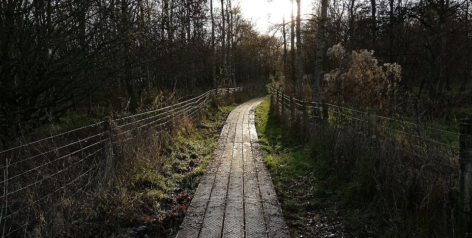Now you leave the wood, come out into the park, heading south west across shaved grass encountering happy dogs and cheerful owners. Go past the dead oak, pale and sculptural, down to the shallow stream burbling bright and clean under the bridge where there might be trolls, then step along a rising boardwalk to the narrow lane.