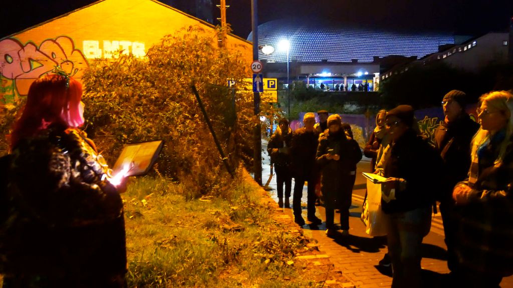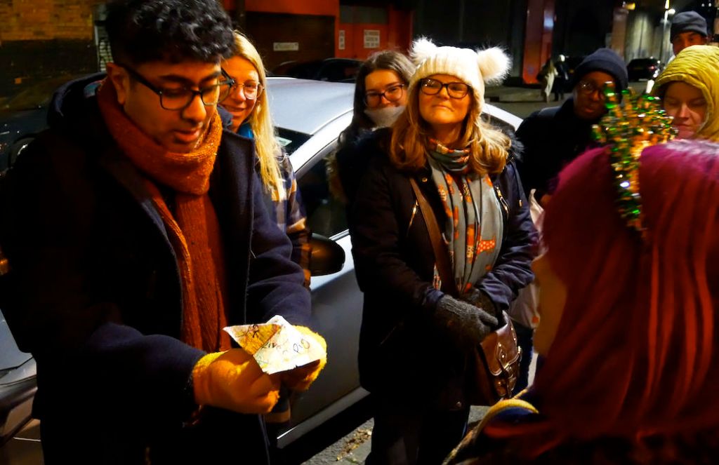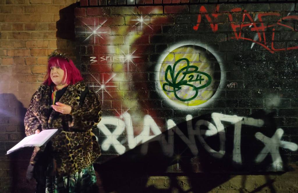 Close your eyes for a few moments, and take a walk in your mind. Wandering urban backstreets and city corners, you pause at a piece of graffiti where a woman with bright pink hair is speaking into the night beneath a spray-painted cosmos of planets and stars. A group of curious-looking people in warm coats stand around her, listening intently. To the average passer-by, we are an intriguing collection of oddballs standing around, loitering on an almost freezing November night. They would be right.
