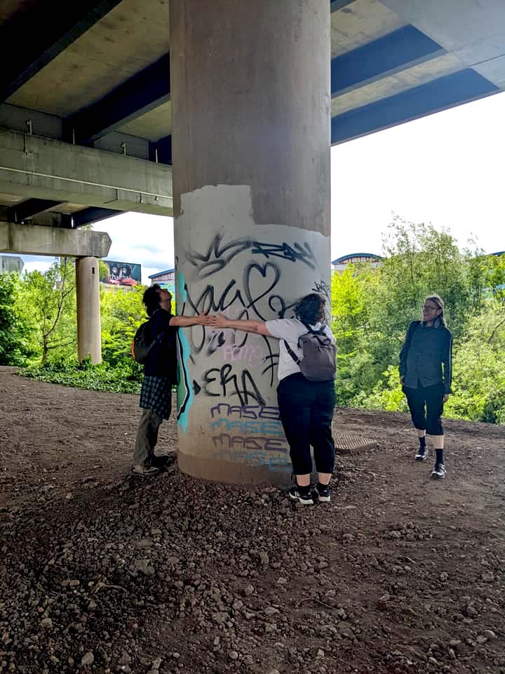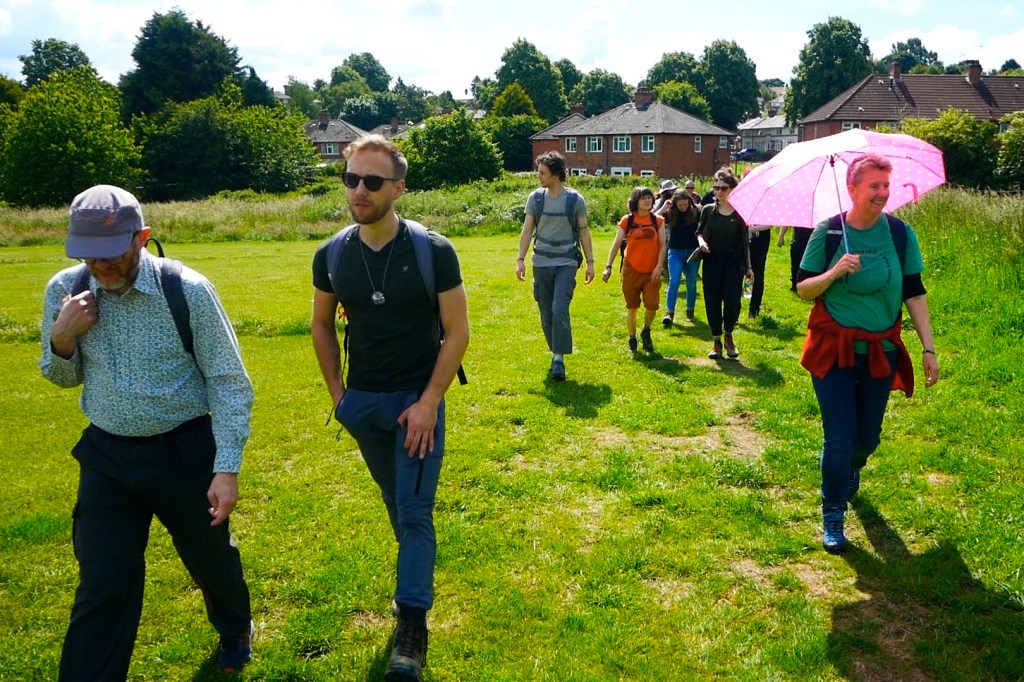 We access the old railway line via an arched bridge, passing a grandad, father and son playing with toy guns. The father is slumped convincingly motionless in the middle of the bridge, and I initially suspect alcohol or madness rather than the play acting of a street shootout. I should have known; we are about to head through the suburb of Compton. While at university in Wolverhampton I remembered the name of this area as it held part of the campus (a business school). I now recall the incongruity of the more famous name of N.W.A.’s LA home associated in my mind with the ‘scream bar’ cosseted culture of my new labour university experience, when I used to crave some sort of transgressive authenticity. I know this Compton campus has long since closed and want to see some evidence of what the building has become. The walk doesn’t want me to go there, and the old railway line affords us no such viewing point. We head straight out of the area.