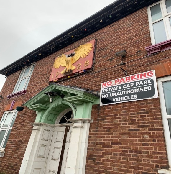 We head northwest out of the city centre looking for the Hordern Road. Halfway along Hordern, in Tettenhall, The Golden Eagle pub sits at the junction with Court Road. It’s square, stocky, brick façade features an arched double doorway that has a large red plaque above it bearing the date 1928. Perched atop the date is the eponymous animal in gold, wings aloft, with a gaping hole reaching far back into the brickwork where its head should be. A similar sized but much younger sign to the right of the doorway bears the imperatives ‘NO PARKING. NO UNAUTHORISED VEHICLES.’ This sign hints at the more recent history of this public house building, which was in the local news for being repurposed as a mosque without the proper planning permission. Reports on this ‘misuse’ included quotes from residents complaining of ‘chocablock’ traffic on Fridays. One unidentified Tettenhall resident swore that they had no problem with the building being used as a mosque, ‘as long as it was done through the proper channels’’. In tribute perhaps to the 16th Century English Reformation and its rejection of requiring the assistance of the proper channels to access salvation, the number of cars parked outside the building and on the pavement on the day Clive and I walk past suggest that the following of local council rules and regulations is still not the primary concern of the current patrons.