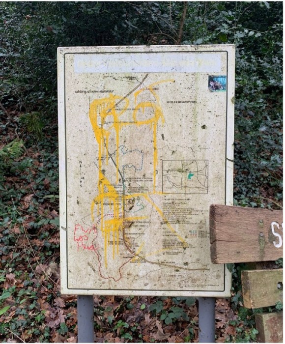 Getting back to the main route, and for the final part of the old railway Clive and I are by now moving with silences stretched out; the constant hum of traffic and bursts of birdsong bringing down the gloaming. The path is interrupted by a series of short, deep-cut bridges, the most infamous of these known as the ‘Wombourne Bridge’. It is this I am looking for to facilitate our departure from the line and bring the day to a close. The sides of those we pass under are covered in forgettable graffiti, but this caused enough of a concern locally for former South Staffordshire and Boris Johnson cabinet MP Gavin Williamson to be photographed in the news next to these daubs, as part of a campaign to protect the ‘Best Kept Village’ reputation. In contrast, no politician has thus far been photographed next to the racist slogans that often appear on the aforementioned ‘Wombourne Bridge’, not hidden below it but put boldly on the sides facing oncoming traffic. In the last year this has meant drivers on the A449 have passed daily under directives such as ‘White Lives Matter’, until they are washed over by the council. I play detective on two fronts for a while, not only keeping an eye out for the bridge itself but speculating if any of the very few people we come across could be the culprit, popping out to walk the dog with a can of (obviously) white paint in the back pocket.