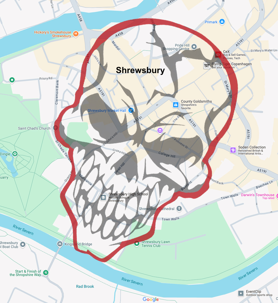 The Shrewsbury Skull was created by Paul Wakelam and Andrew Howe by superimposing a skull image on a map of the town centre, within the course of the River Severn, and then walking the outline in the real world on Halloween night last year. This year they’re ready for company.
